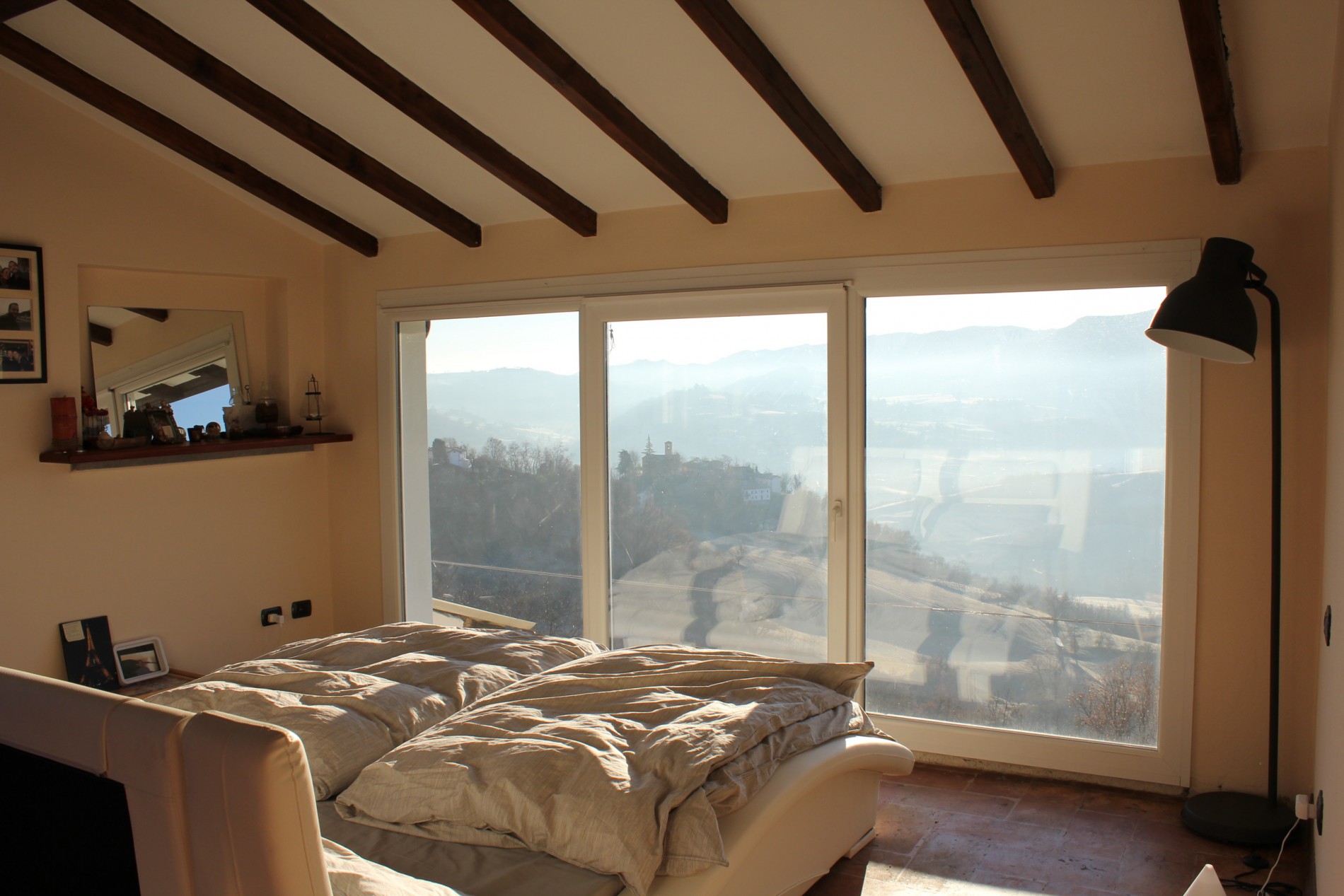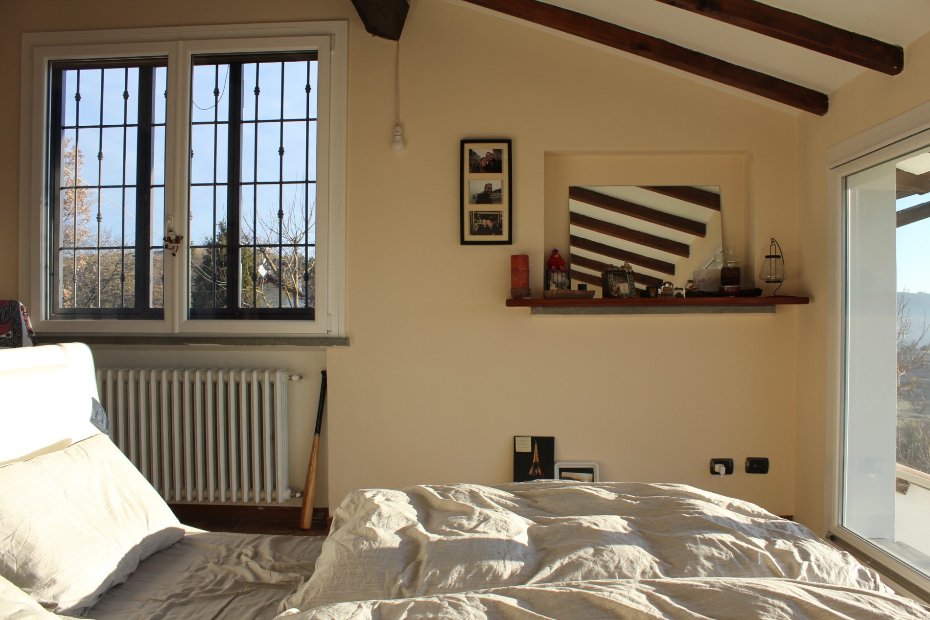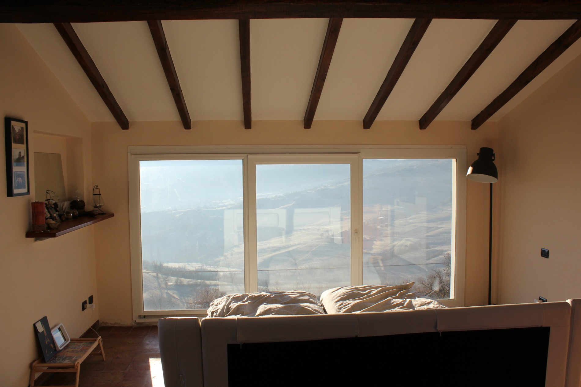 Ristrutturazione di abitazione posta sullo spartiacque tra due stupende vallate del primo Appennino Reggiano, val Crostolo e val Campola. Rinnovata negli impianti, serramenti e arredi, attualmente si presenta accogliente e molto personale, da ogni vano si può godere di una vista sul paesaggio. In particolare dalla camera al Piano Primo grazie alla ampia finestratura a tutta parete si ottiene un effetto di “volo” sulla vallata, un quadro che muta continuamente ad ogni cambio di luce e che rende questa camera unica, con letto posto a centro stanza. L’abitazione molto spaziosa è dotata di ogni comfort e vari bassi servizi, incluso una cantina seminterrata in sasso con volte in laterizio ben conservate.