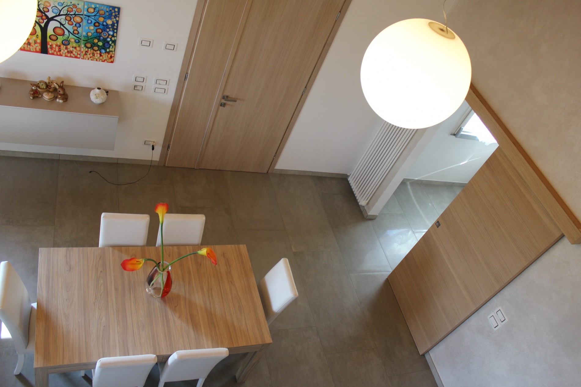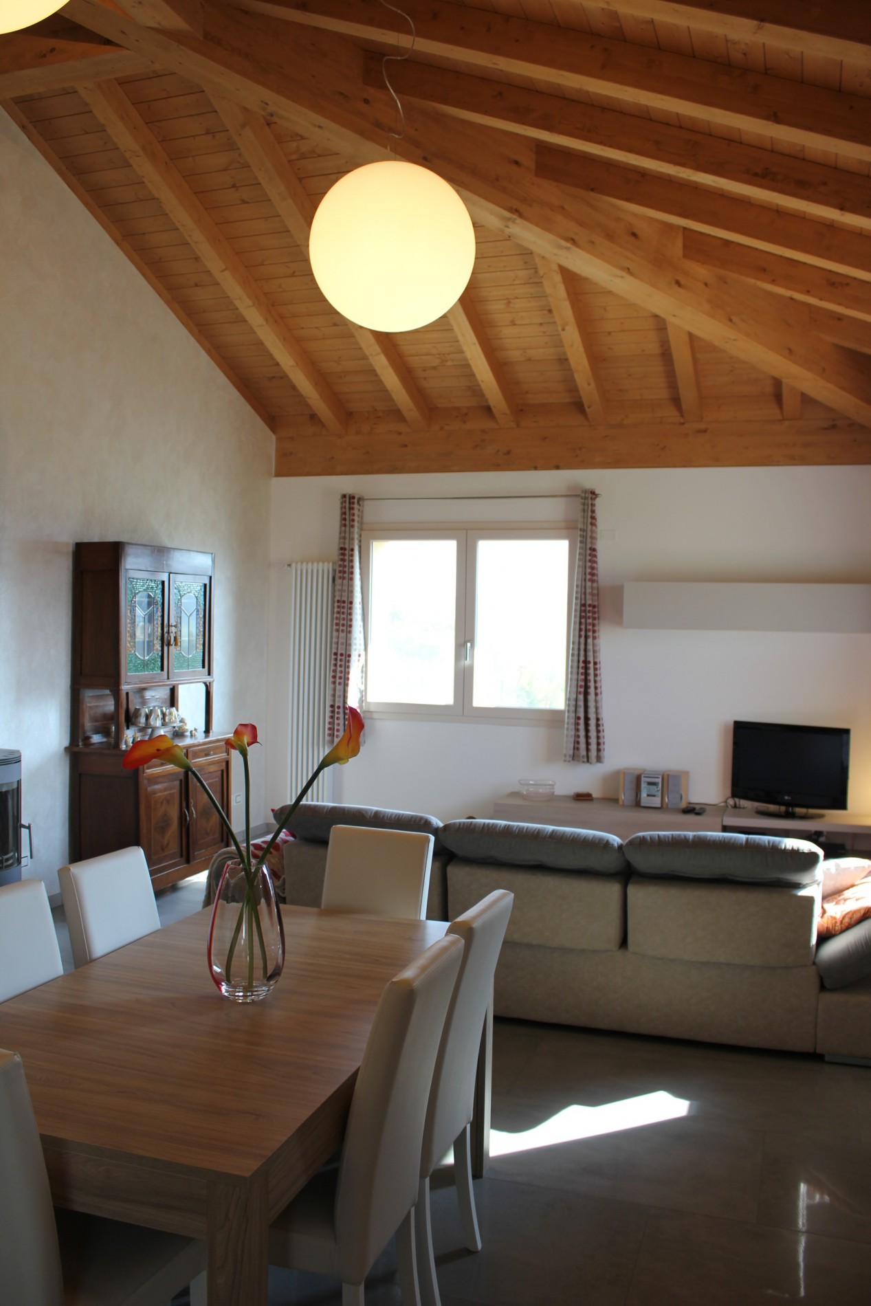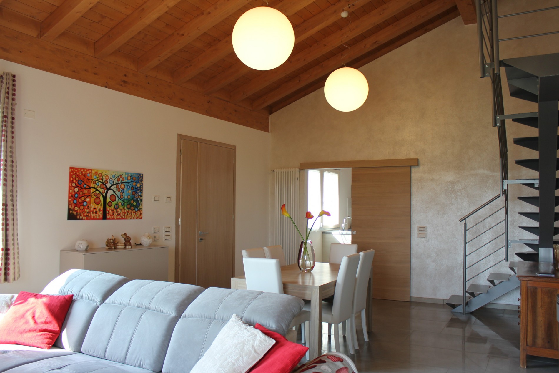 ad eccezione di un sottotetto di servizio al piano mansardato, risulta priva di barriere architettoniche. Dalla scala di accesso al sottotetto si gode la visione del soggiorno, fulcro dell’abitazione. Le ampie finestrature rendono luminosi gli spazi interni e garantiscono viste panoramiche sull’ambiente naturale circostante.